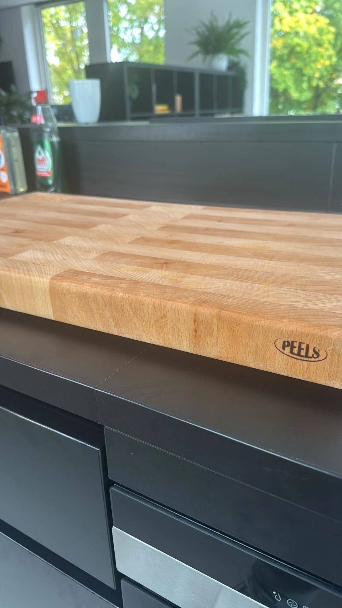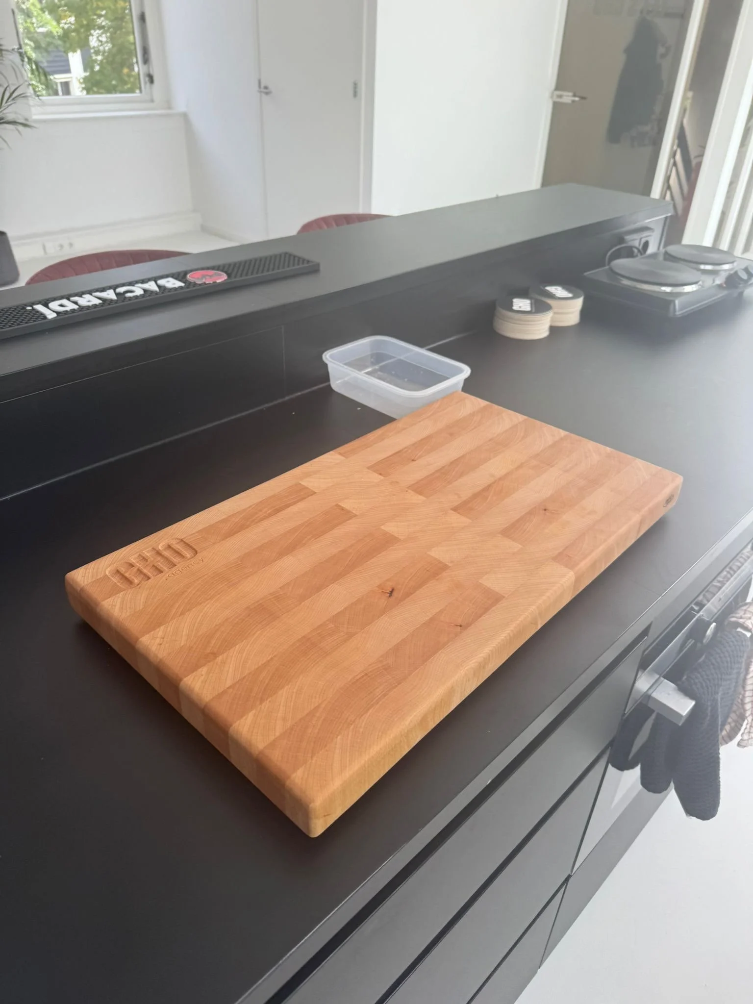 Massief beuken snijplank gemaakt van resthout. Wat het mooie is dat er een logo van een bedrijf van de klant is ingegraveerd! Leuke details