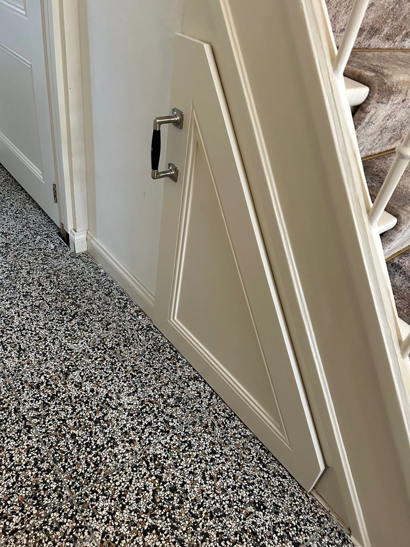Omdat er een open ruimte bleek te zitten onder de trap is er voor gekozen om extra opbergruimte te realiseren. Er is gekozen voor één grote uitschuiflade waar er plek is voor circa 10 paar schoenen. Perfect om de hal netjes te houden!